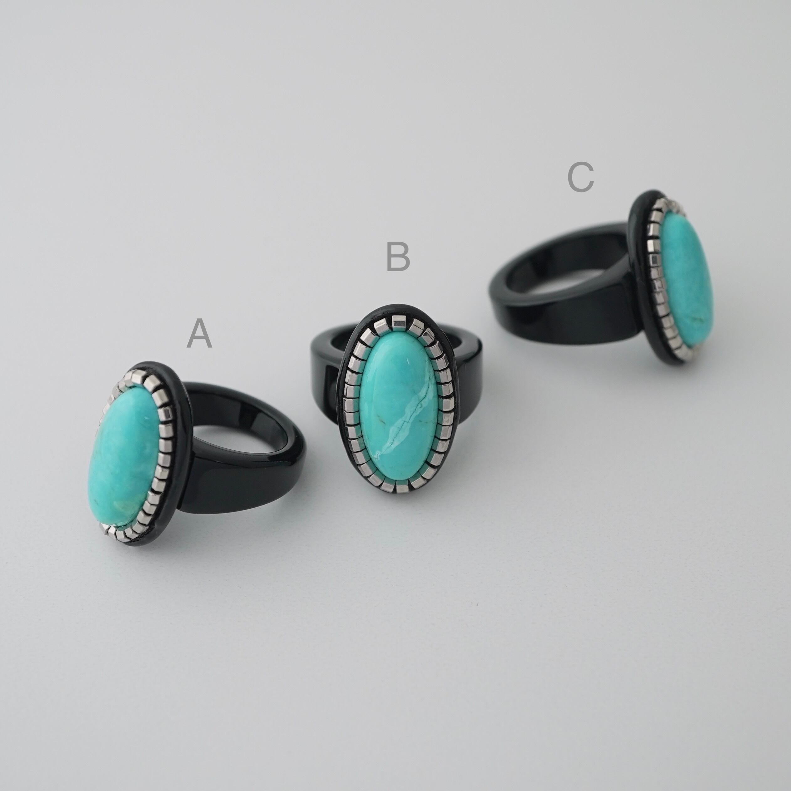 ロングオーバル型のターコイズを使用したリング。