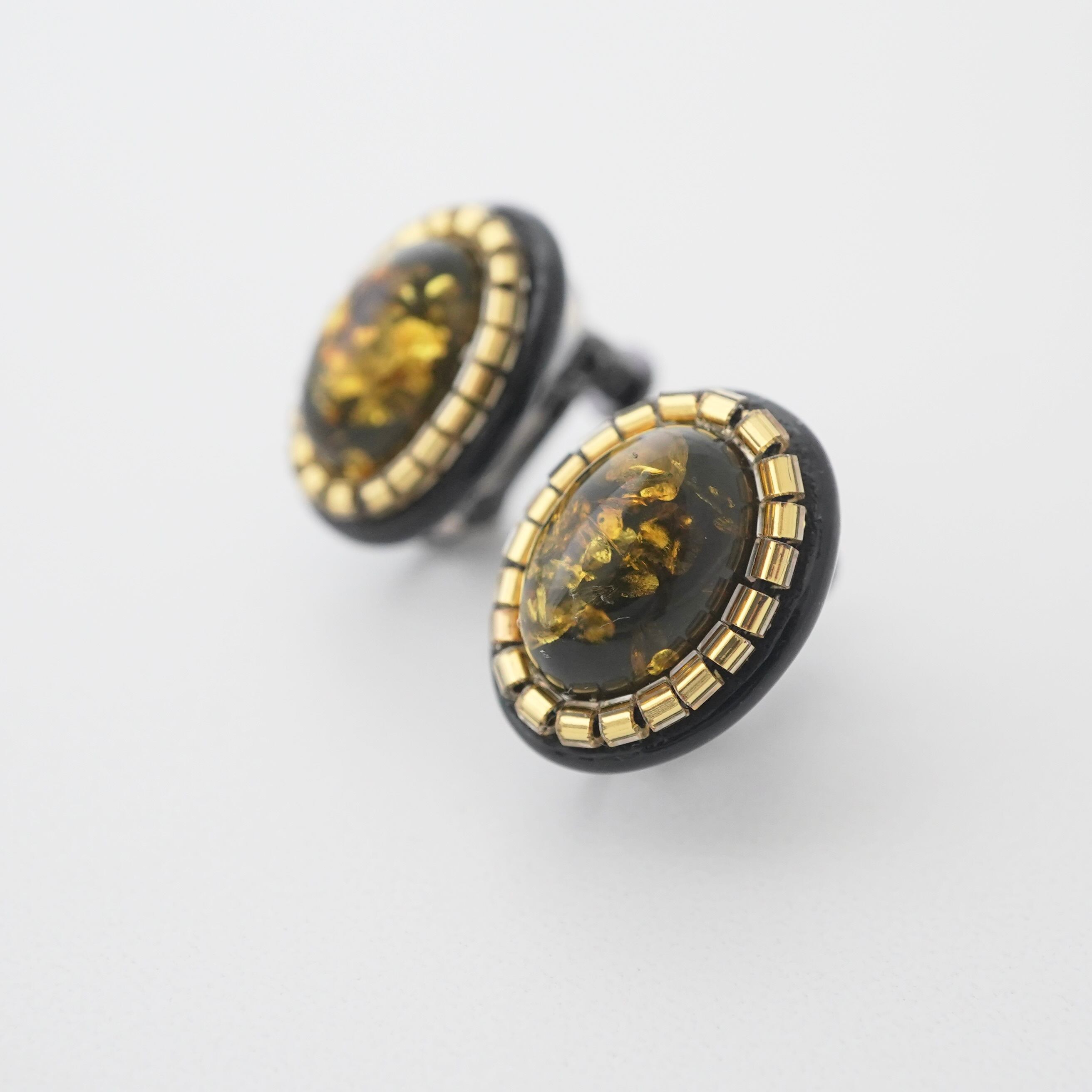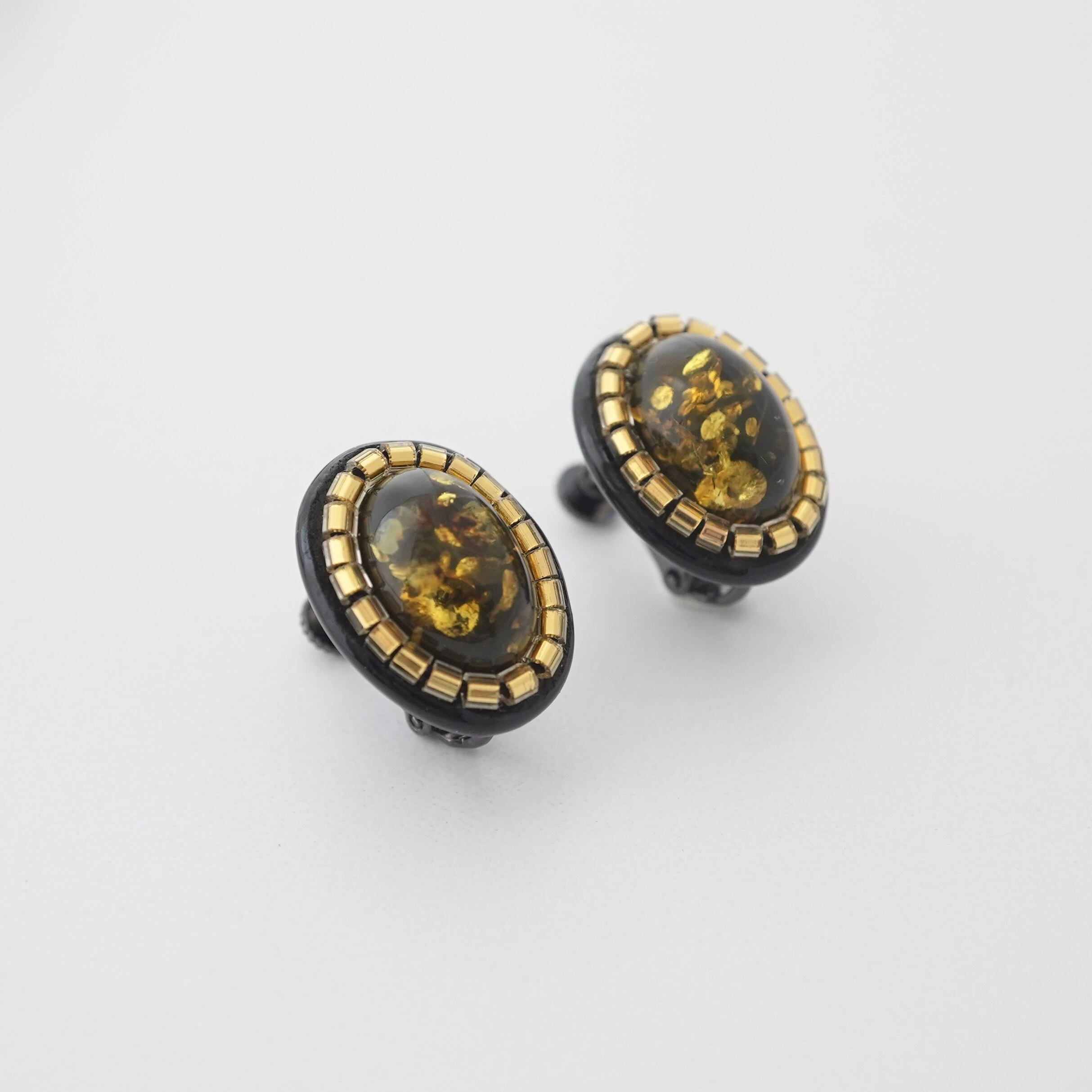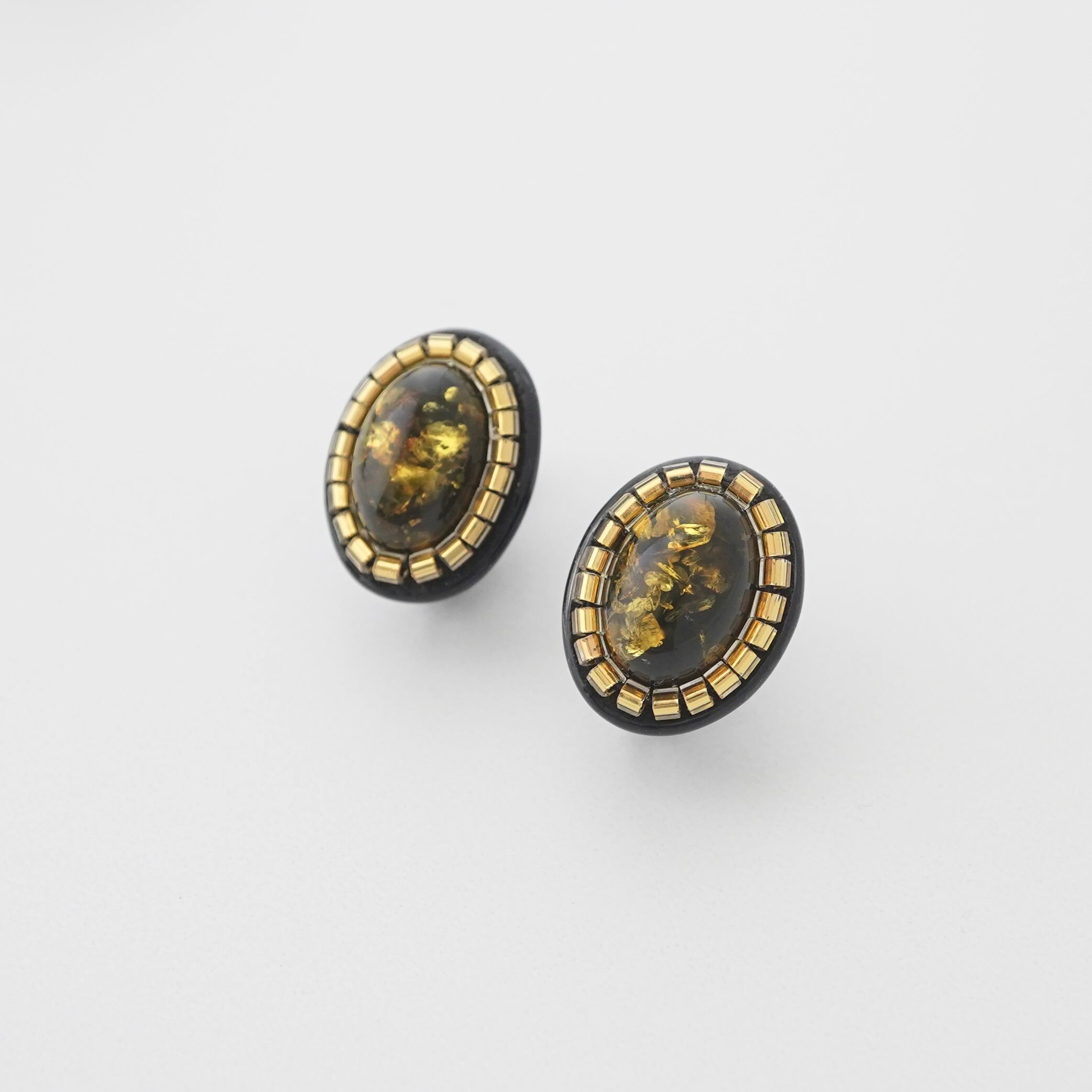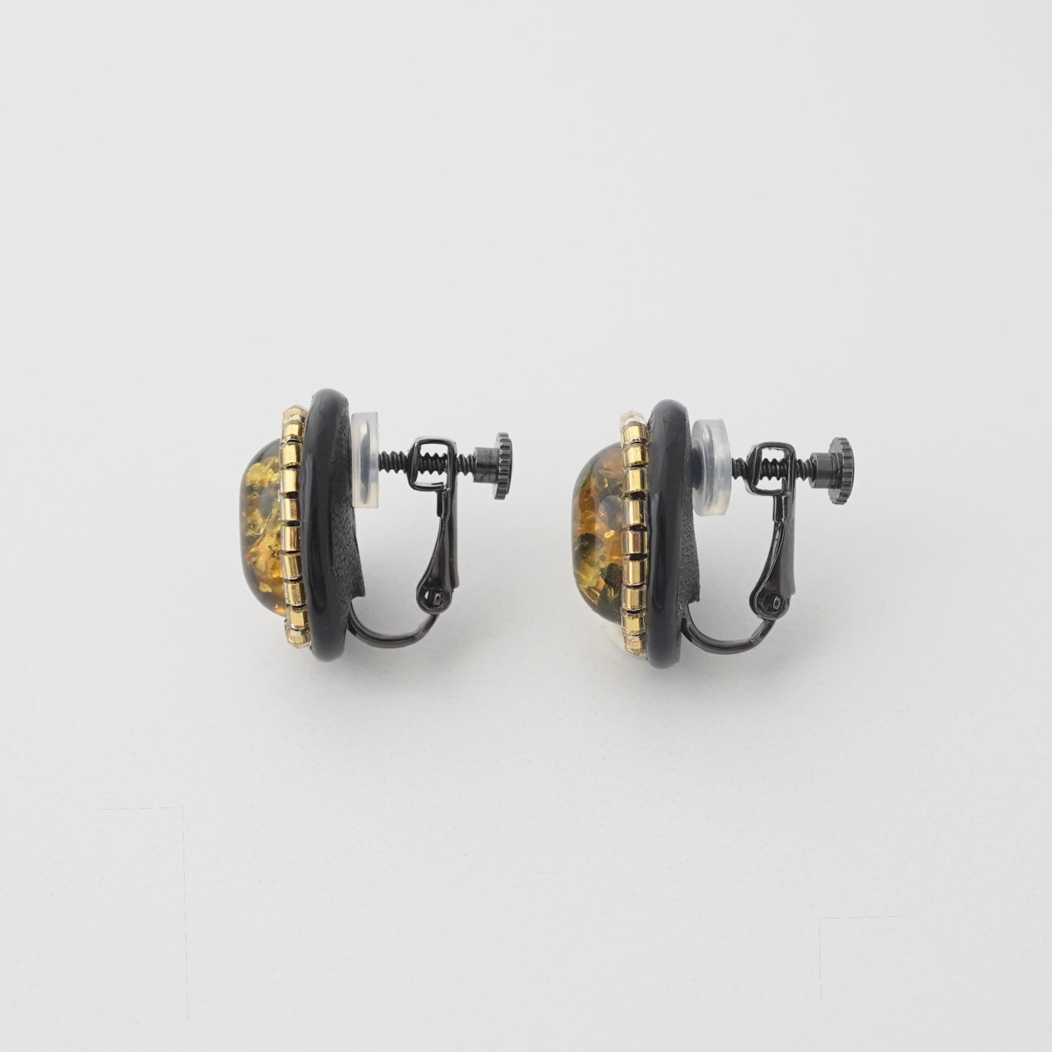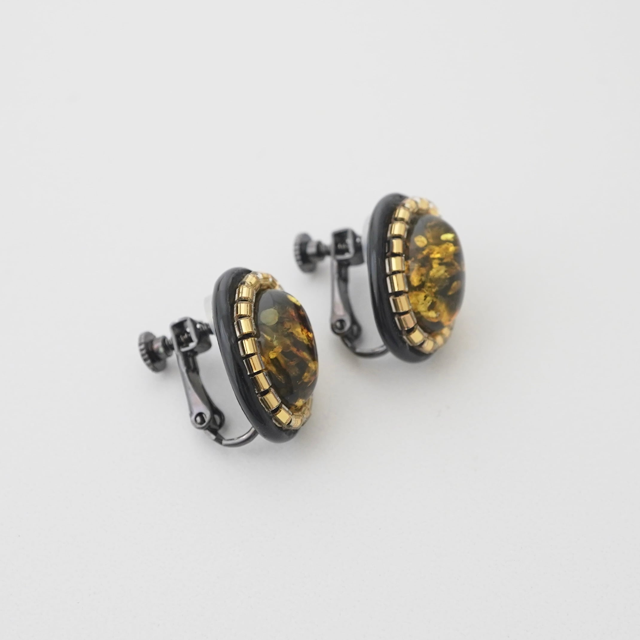 天然素材をベースとしたアンバー(琥珀)は、ひとつとして同じものはなく、一粒ごとに異なるイエローの濃淡や内包物(グリッター)が神秘的な造形を描き出します。 お手元に届くのは、世界にたった一つしかない、あなただけの表情を持ったピース。その個性豊かな出会いも、デザインの一部としてお楽しみください。 周囲を縁取るガラスビーズの輝きも相まって、高揚感を生み出す顔まわりのスパイスとなります。