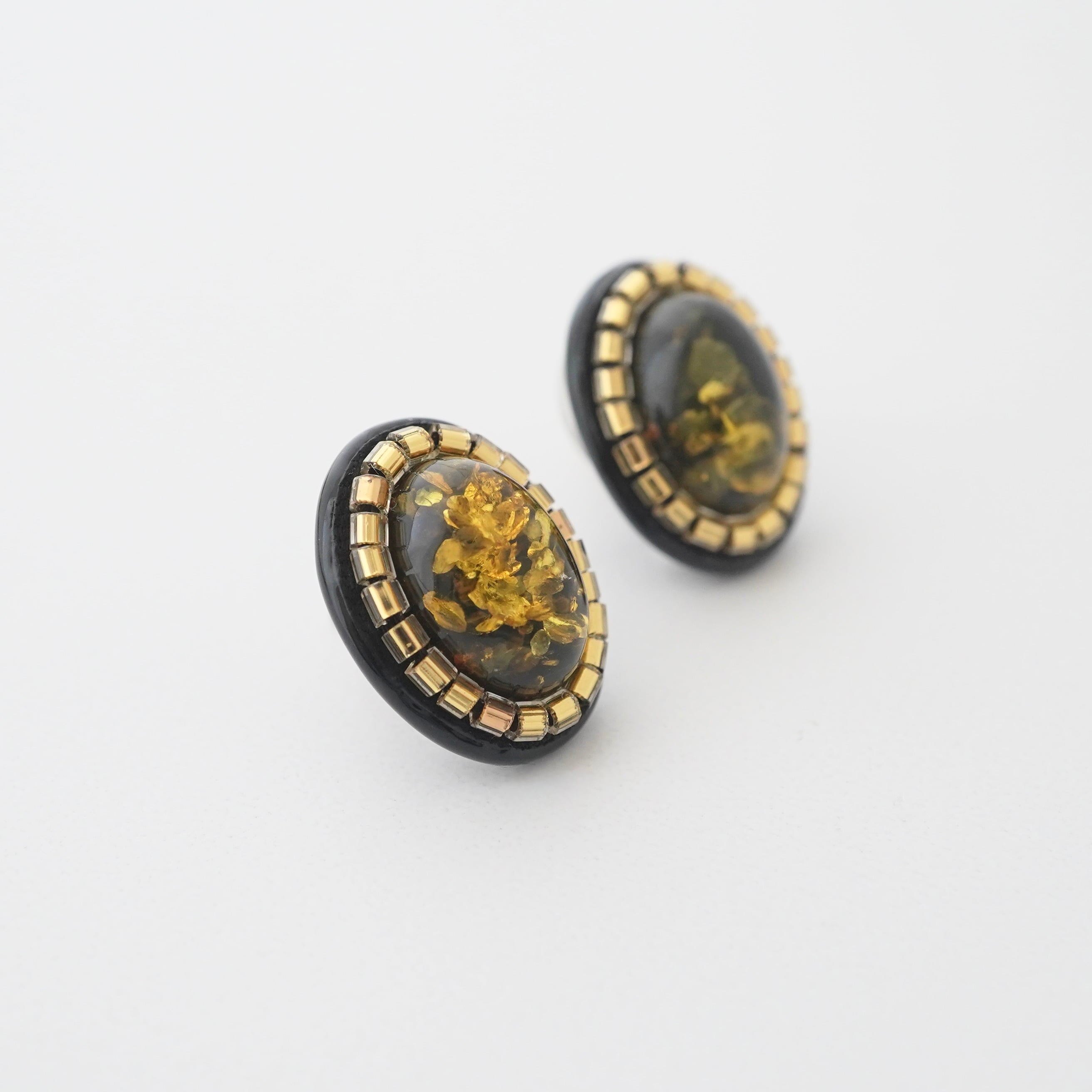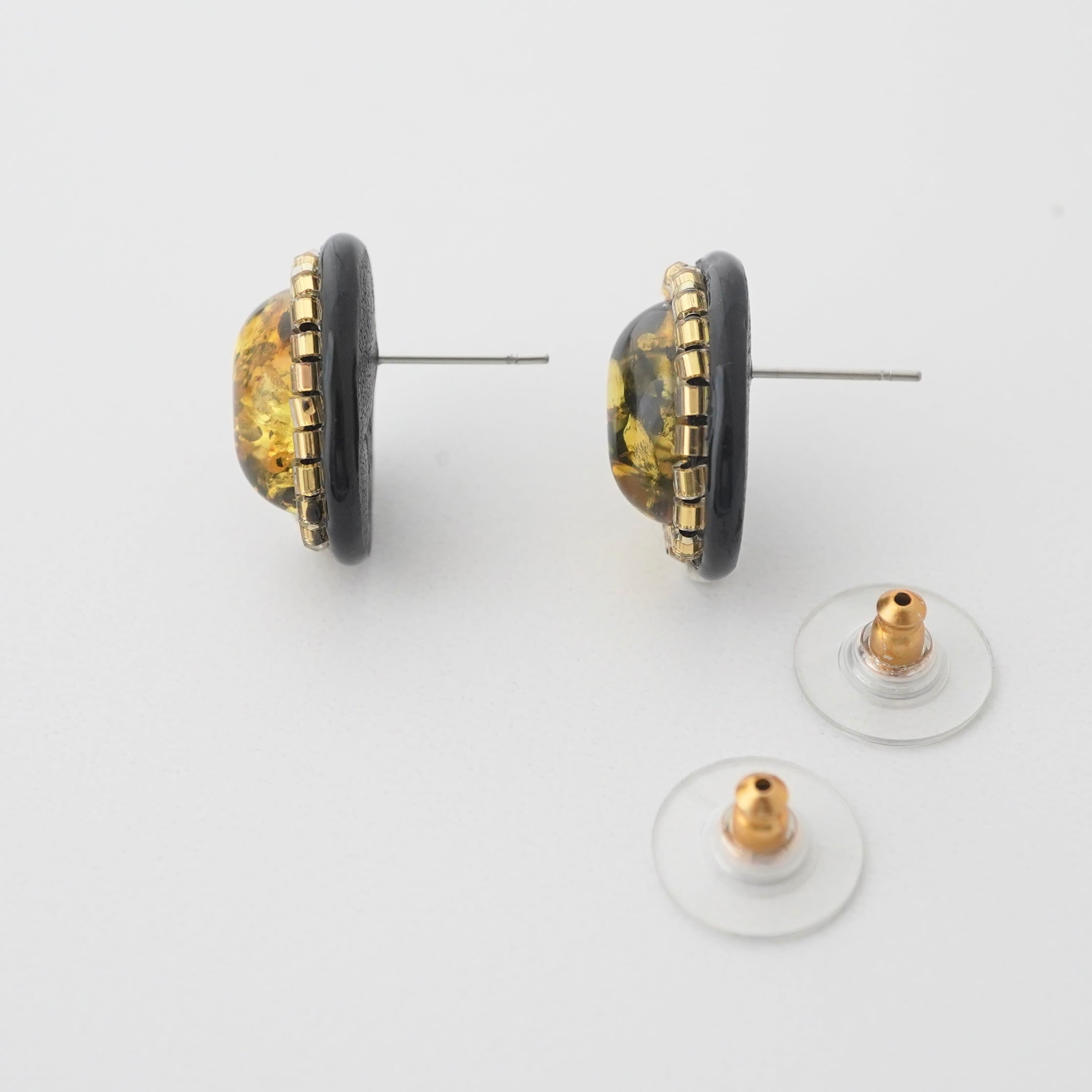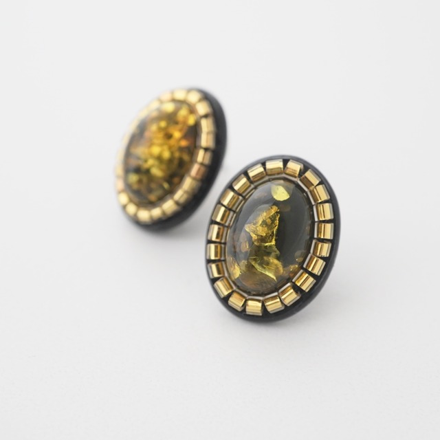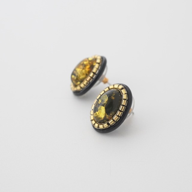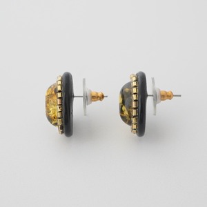 天然素材をベースとしたアンバー(琥珀)は、ひとつとして同じものはなく、一粒ごとに異なるイエローの濃淡や内包物(グリッター)が神秘的な造形を描き出します。 お手元に届くのは、世界にたった一つしかない、あなただけの表情を持ったピース。その個性豊かな出会いも、デザインの一部としてお楽しみください。 周囲を縁取るガラスビーズの輝きも相まって、高揚感を生み出す顔まわりのスパイスとなります。