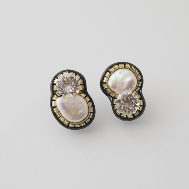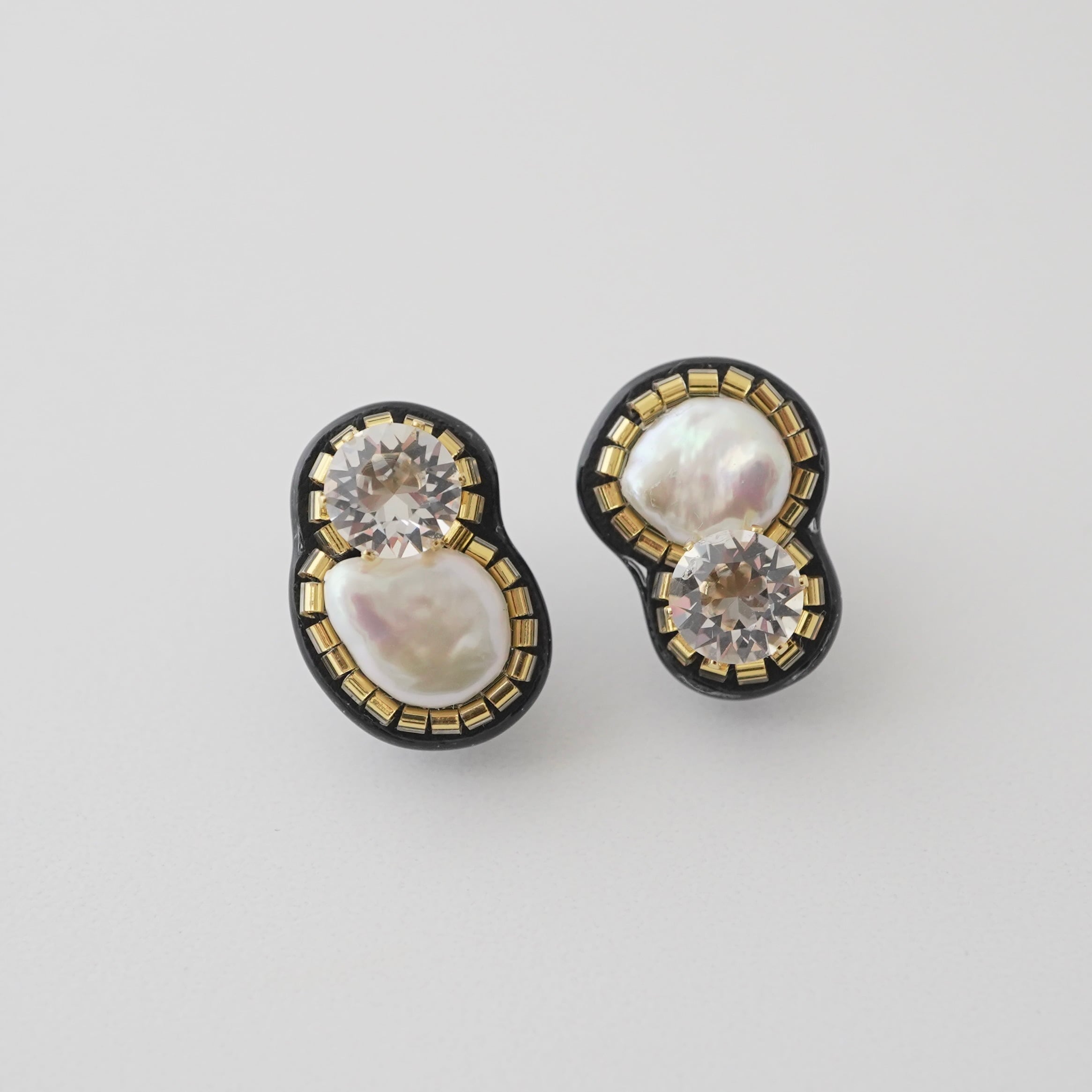 * 不揃いな淡水パールと精緻なスワロフスキー、異素材の対比がリズムを生むデザイン