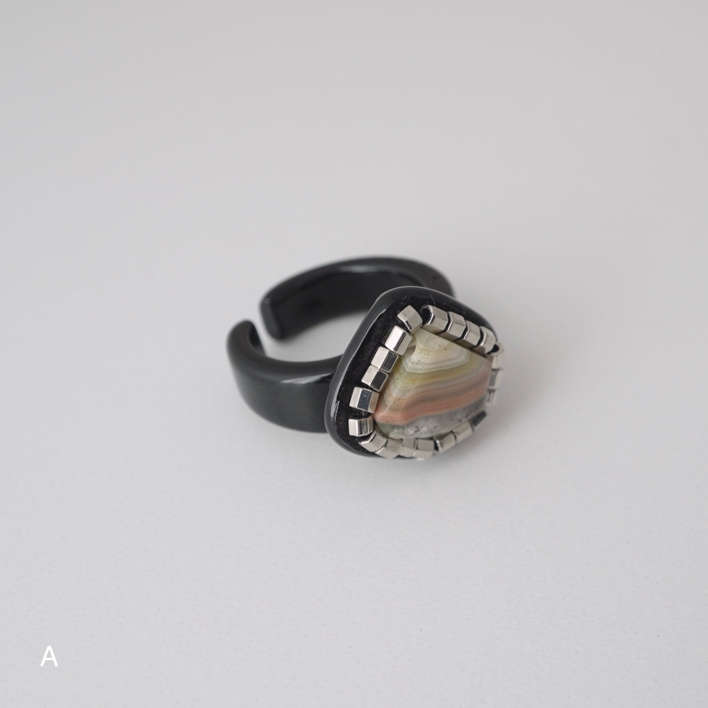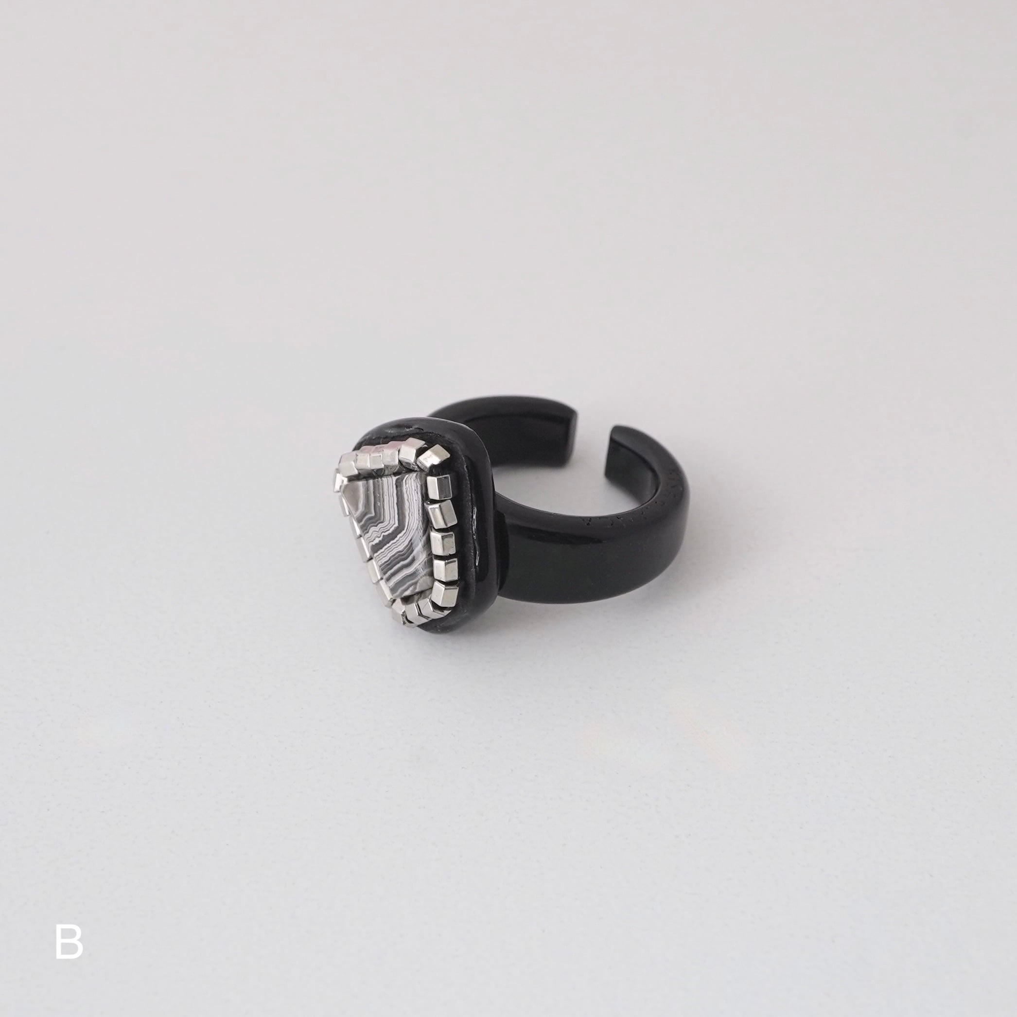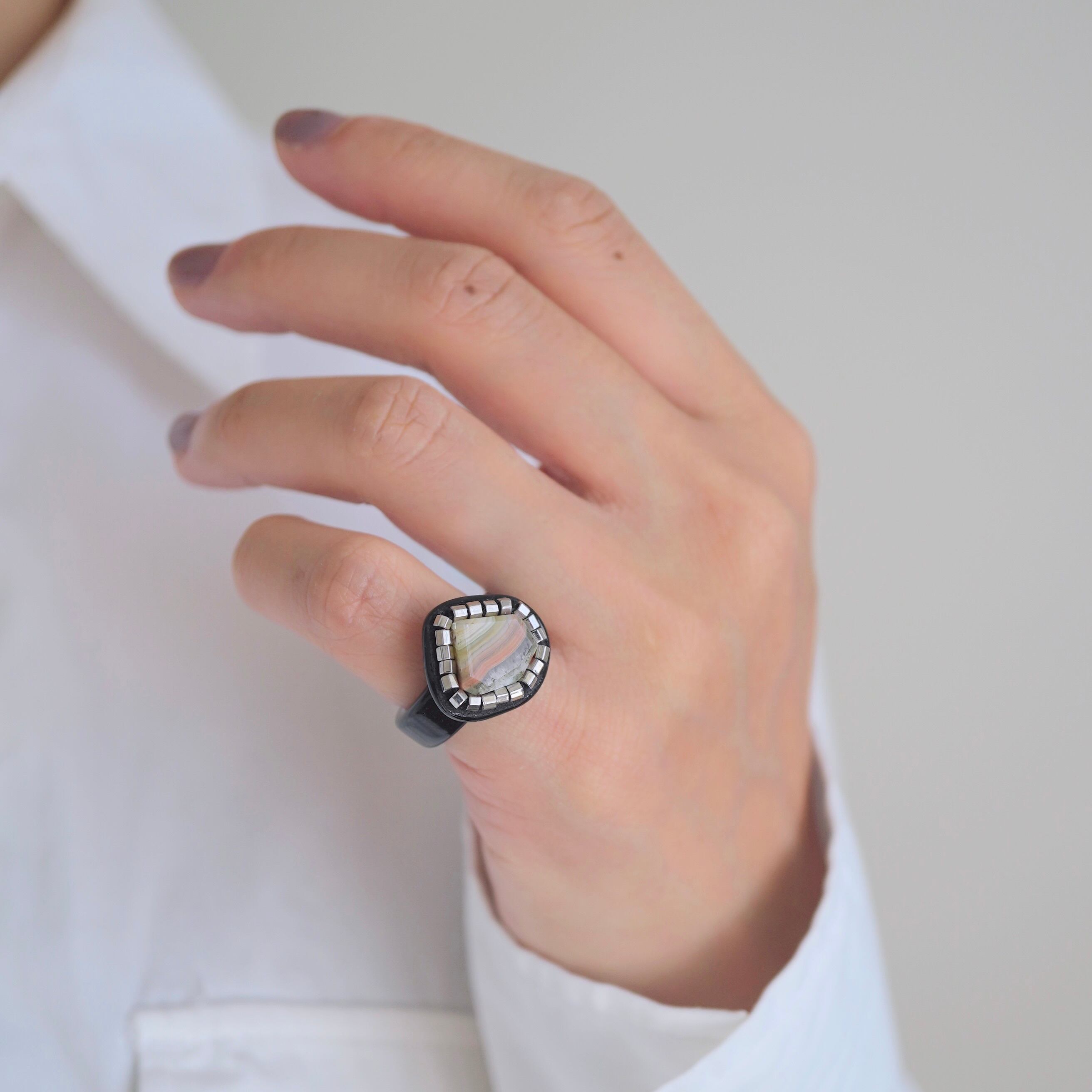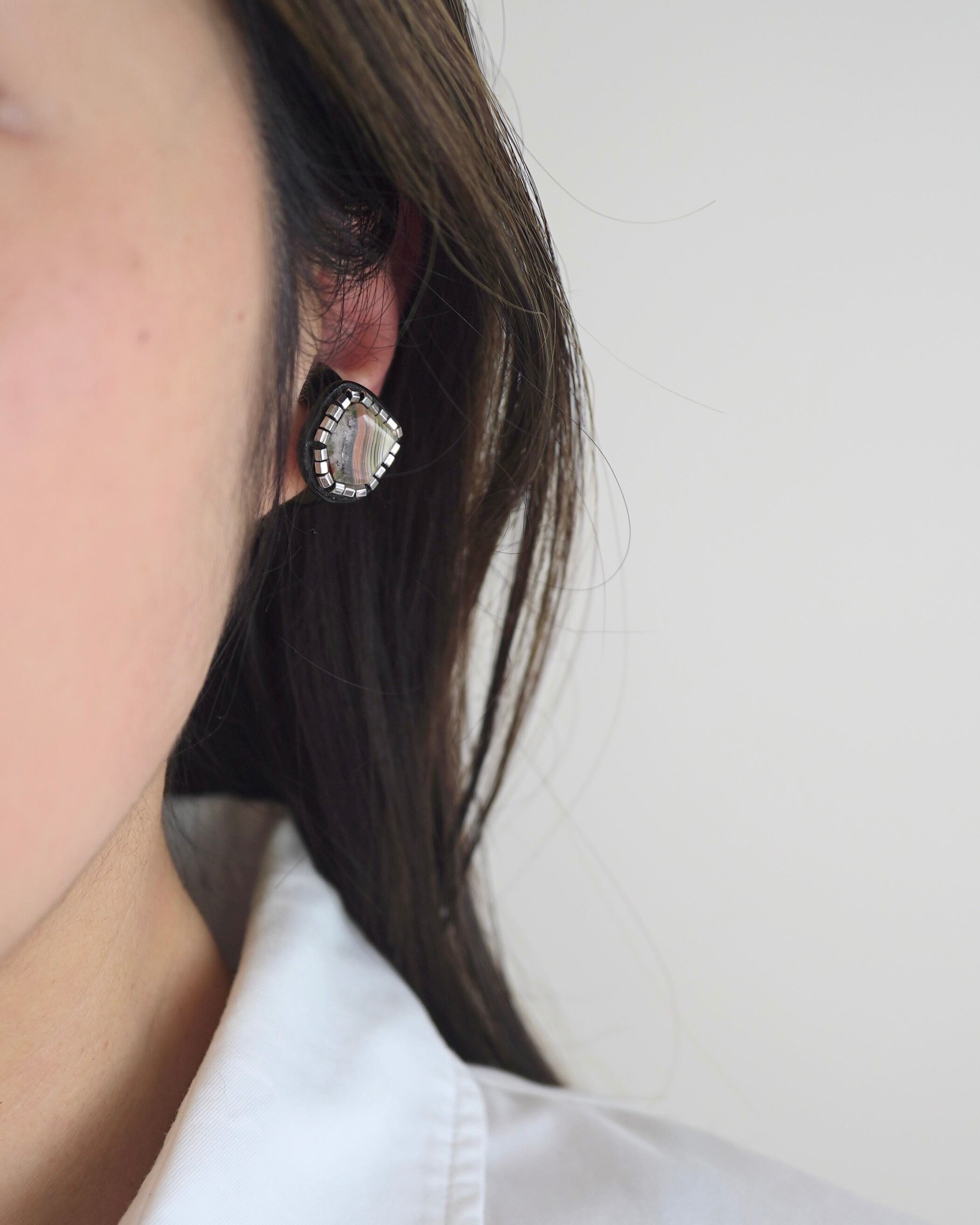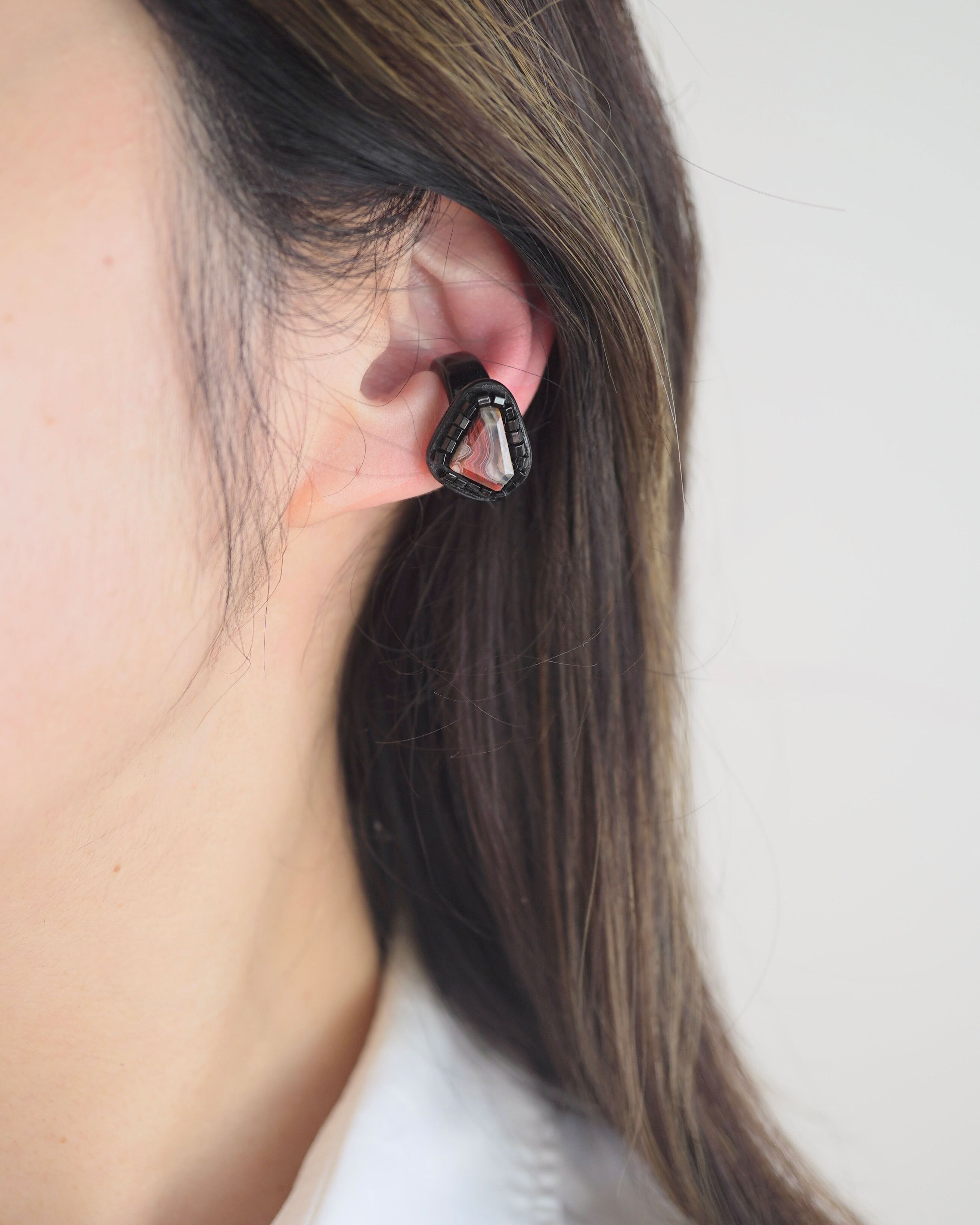 イヤーカフとピンキーリングの 「二面性」を持つ、Duality(デュアリティー)シリーズ。メキシコの大地が長い年月をかけて描き出した、 神秘的な「ラグナレースアゲート」。 幾重にも重なるこの縞模様は、二つとして同じ表情を持たない、あなただけの特別な景色。