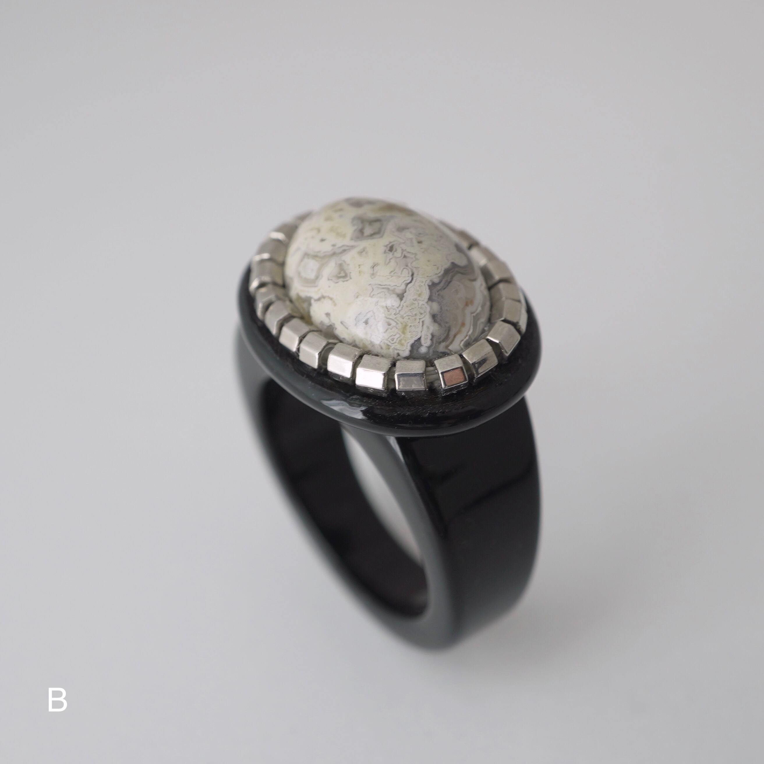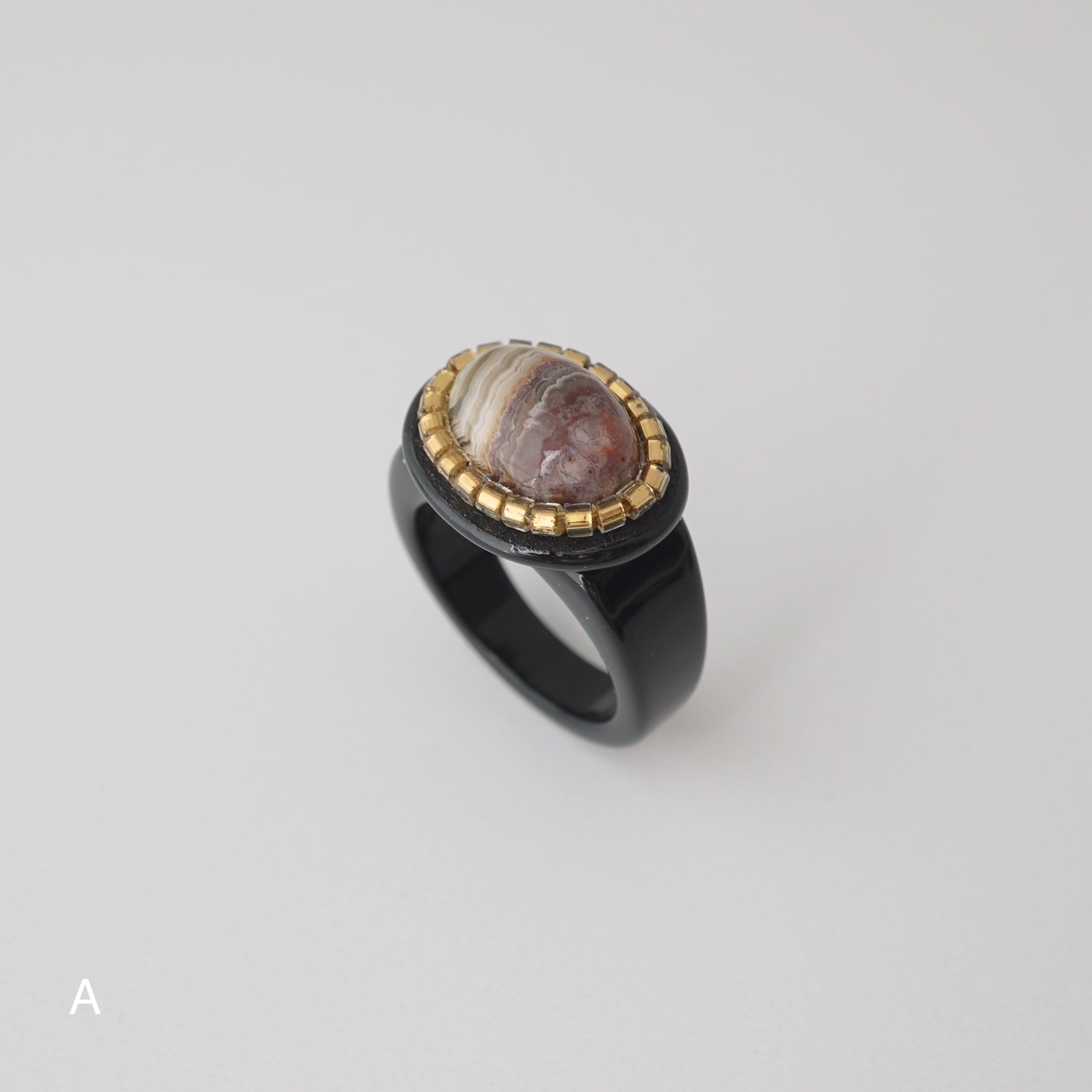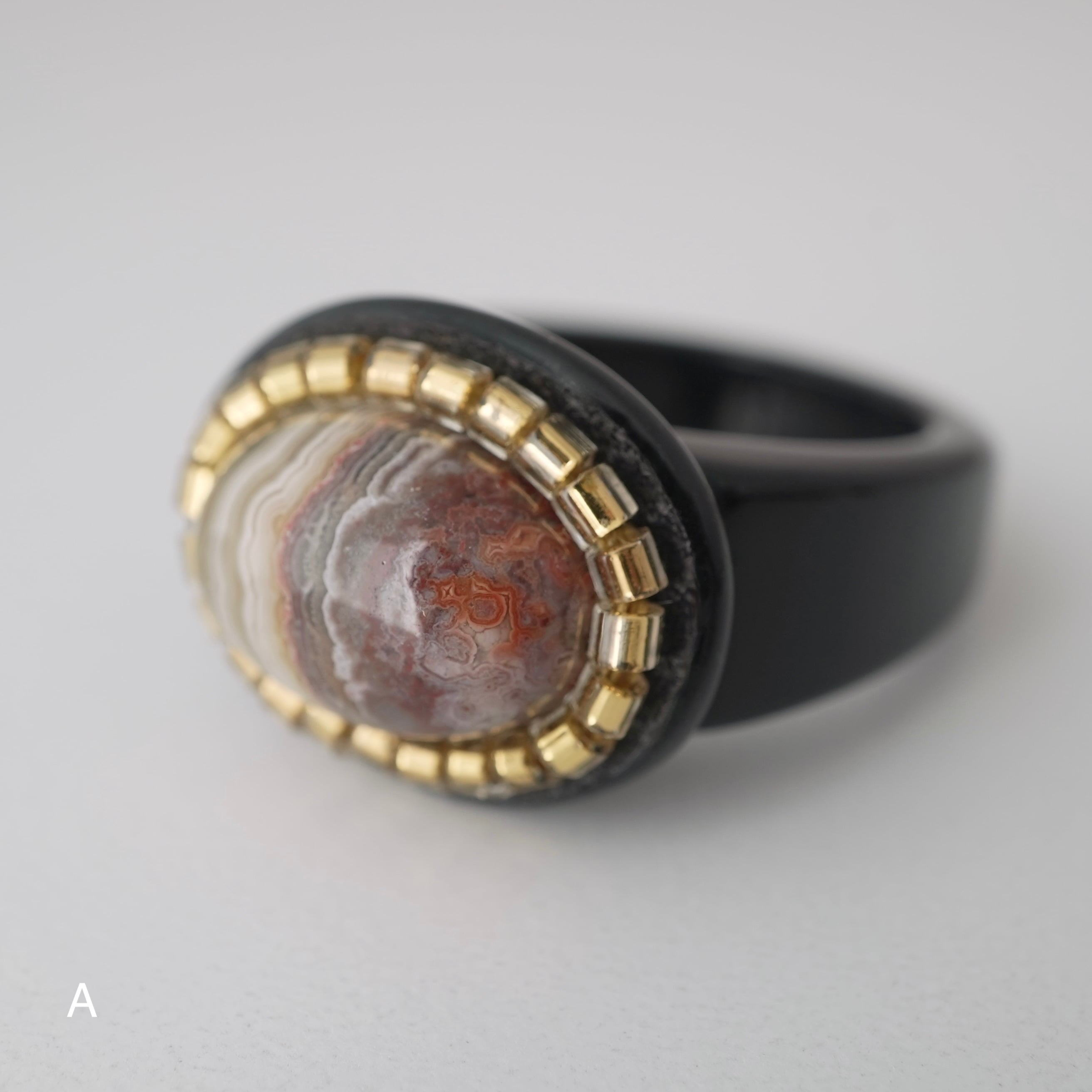 * 質感のコントラスト: アゲートの透明感と本革、漆黒の