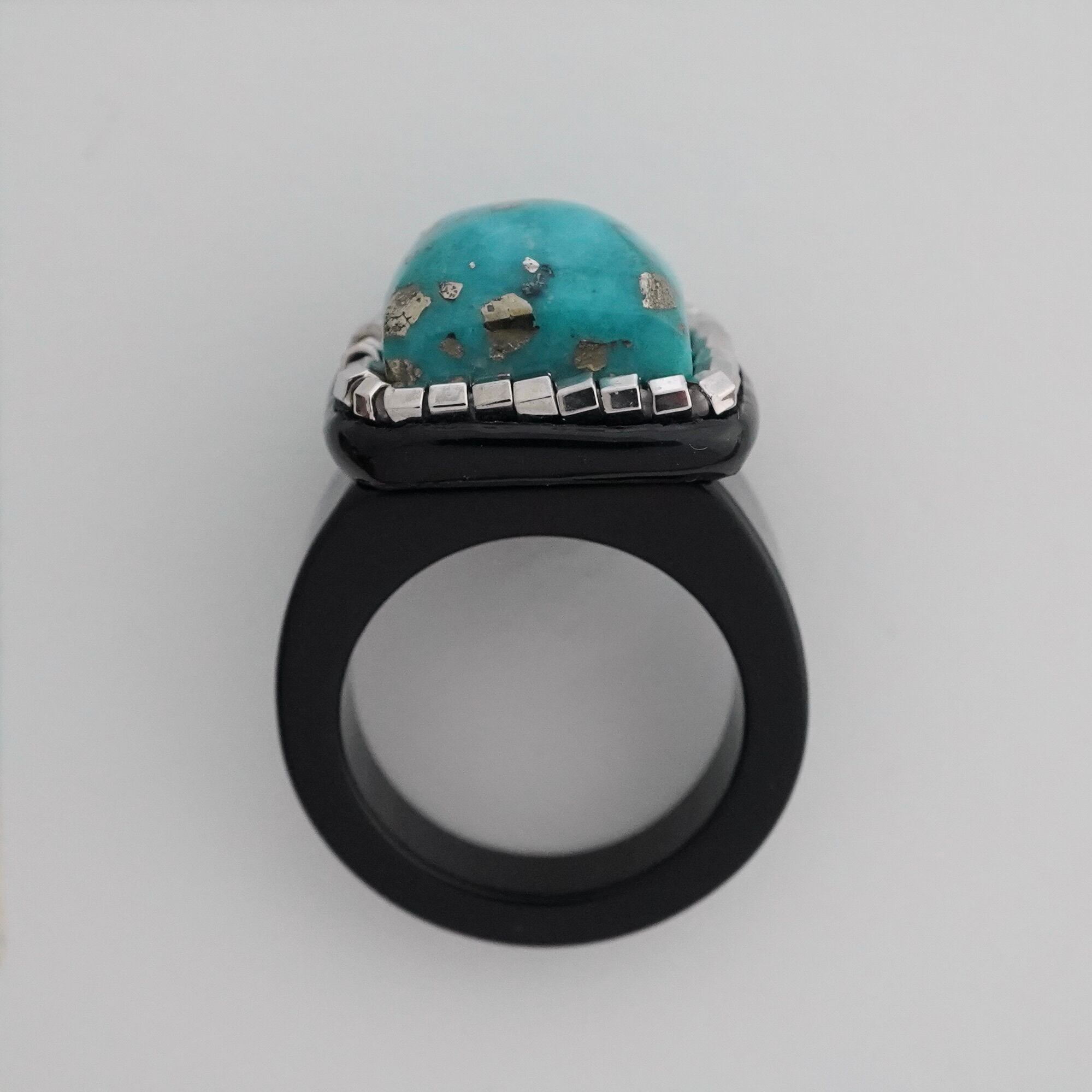 RISA BLANCA夏の定番アイテム「ターコイズ」の新作。パイライトインクルージョンが含まれているトルコ石のリングです。夏らしいアイテムを取り入れたい方にぜひおすすめです。