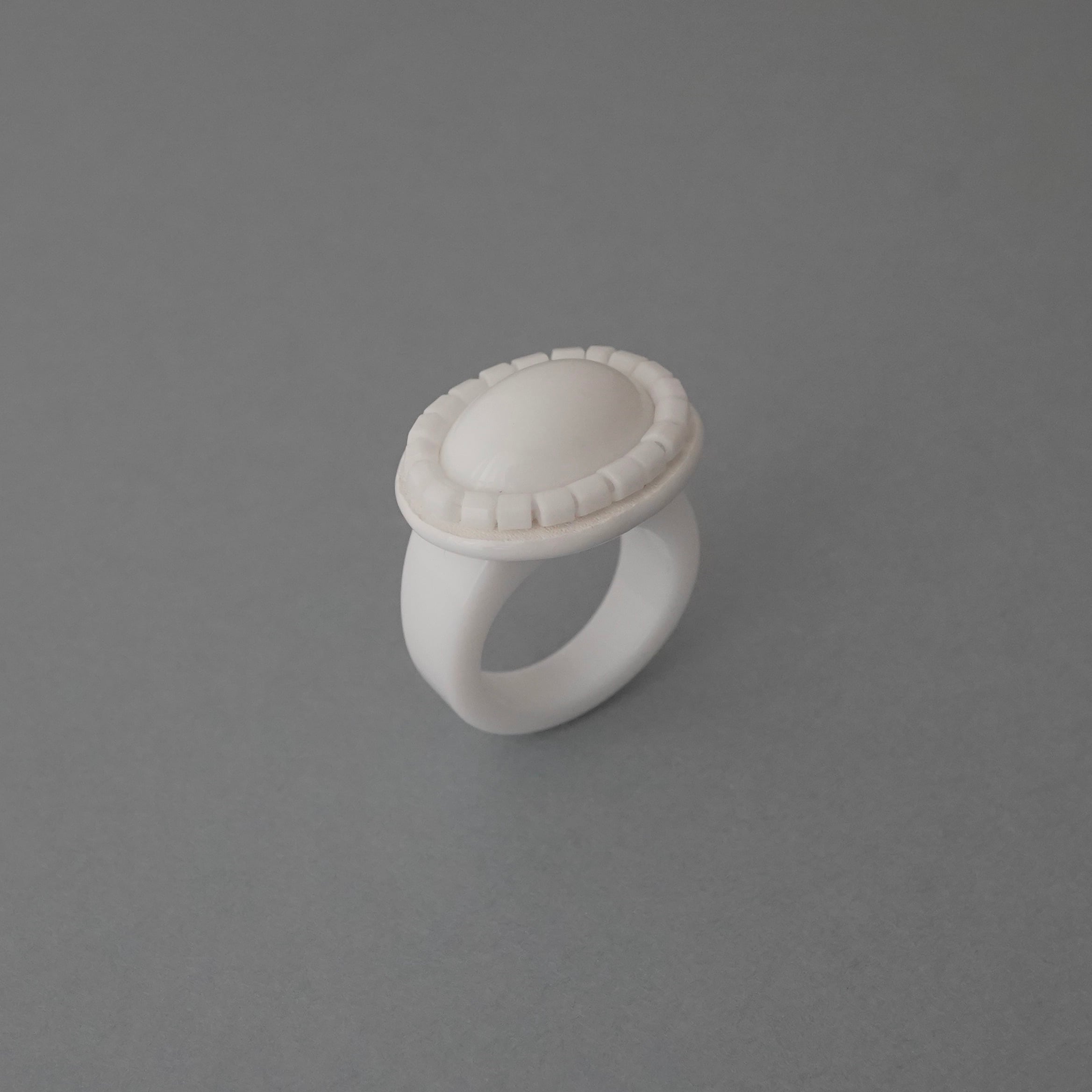 潔いホワイトが特徴のチェコガラスをメインのモチーフに使用したリング。クラシカルなデザインで、手元に映えるシーズンレスなアイテムです。モチーフの向きが横型のデザインです。