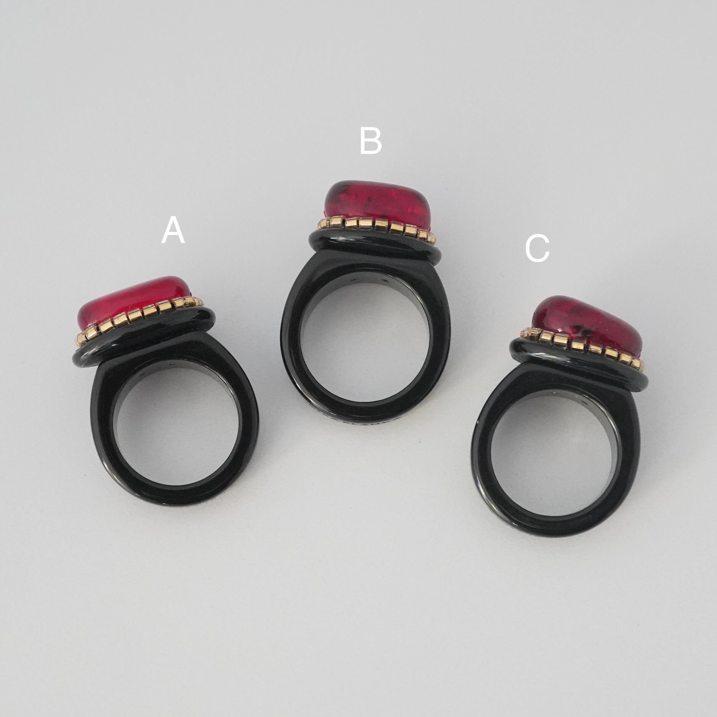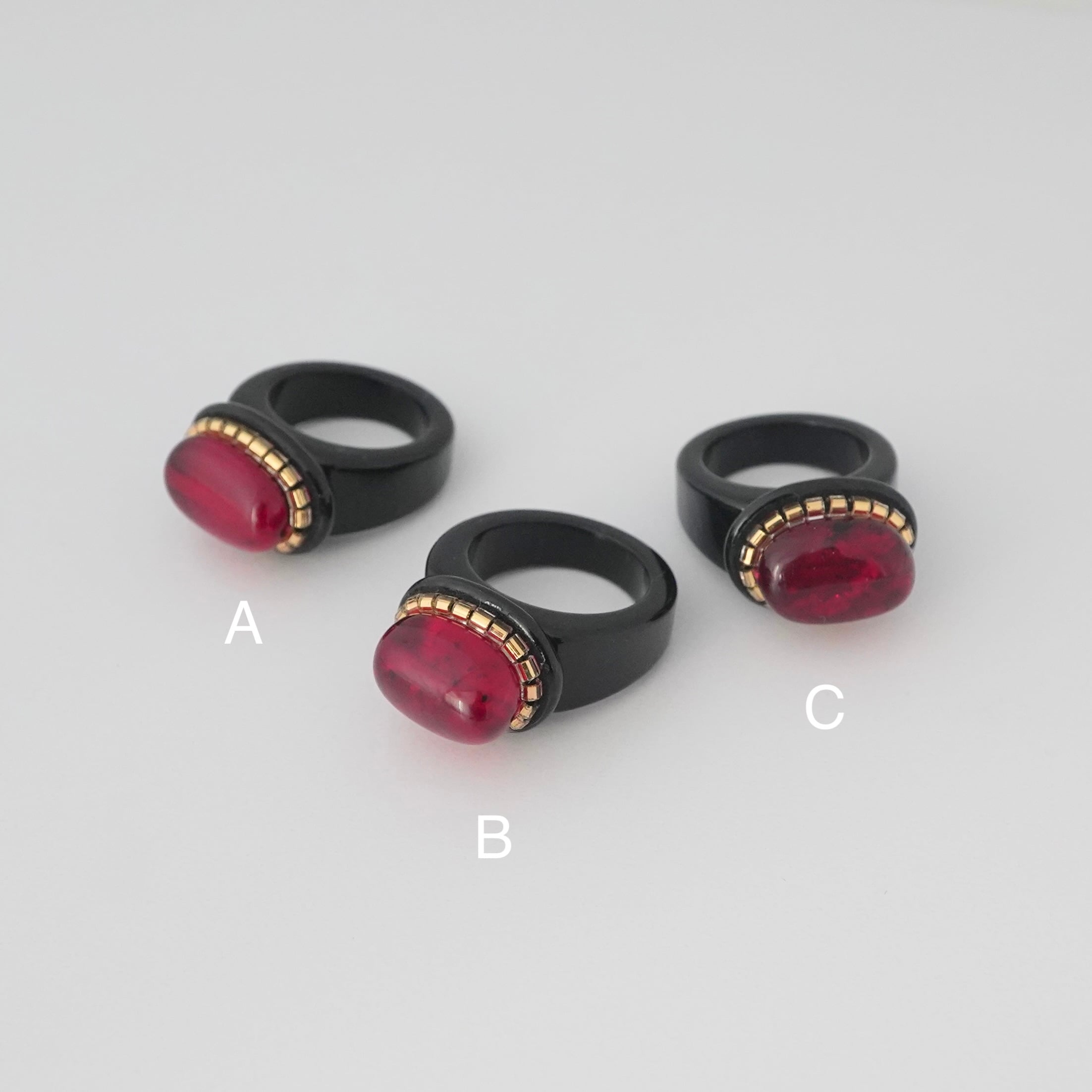 ハーブ等植物由来の染料により赤色に染められたリトアニア産の琥珀をリングに仕立てました。