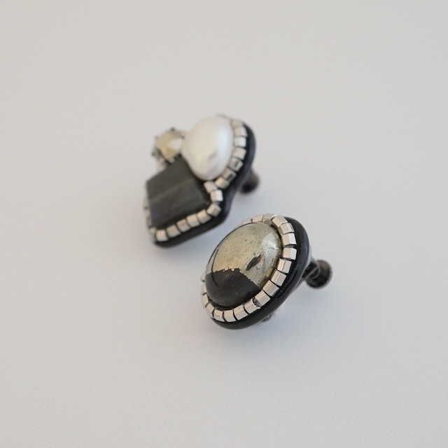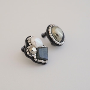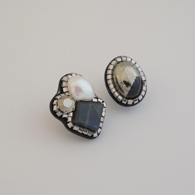 左右のデザインがアシンメトリーなイヤリング。ラブラドライトがメインの3粒タイプに、マトリックスパイライト1粒を合わせました。メタリックなカラーが効いたデザインです。