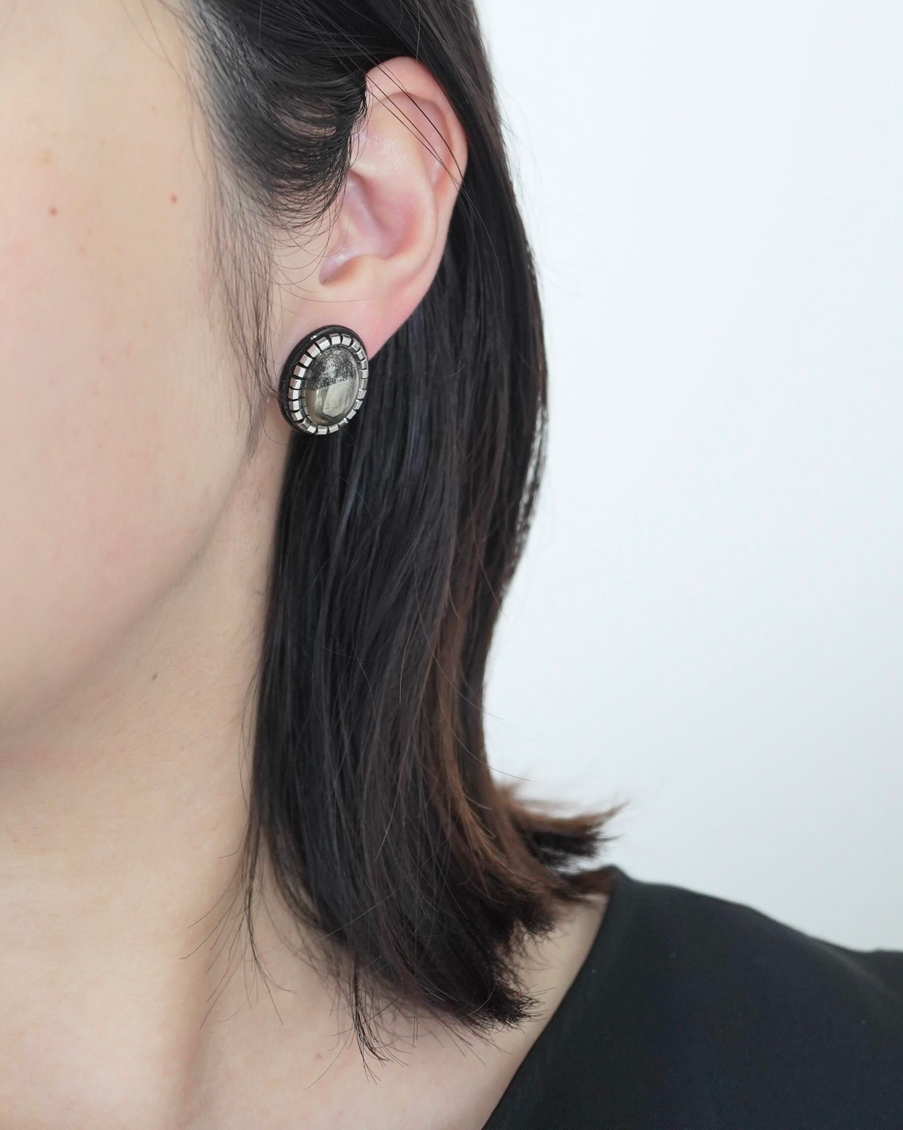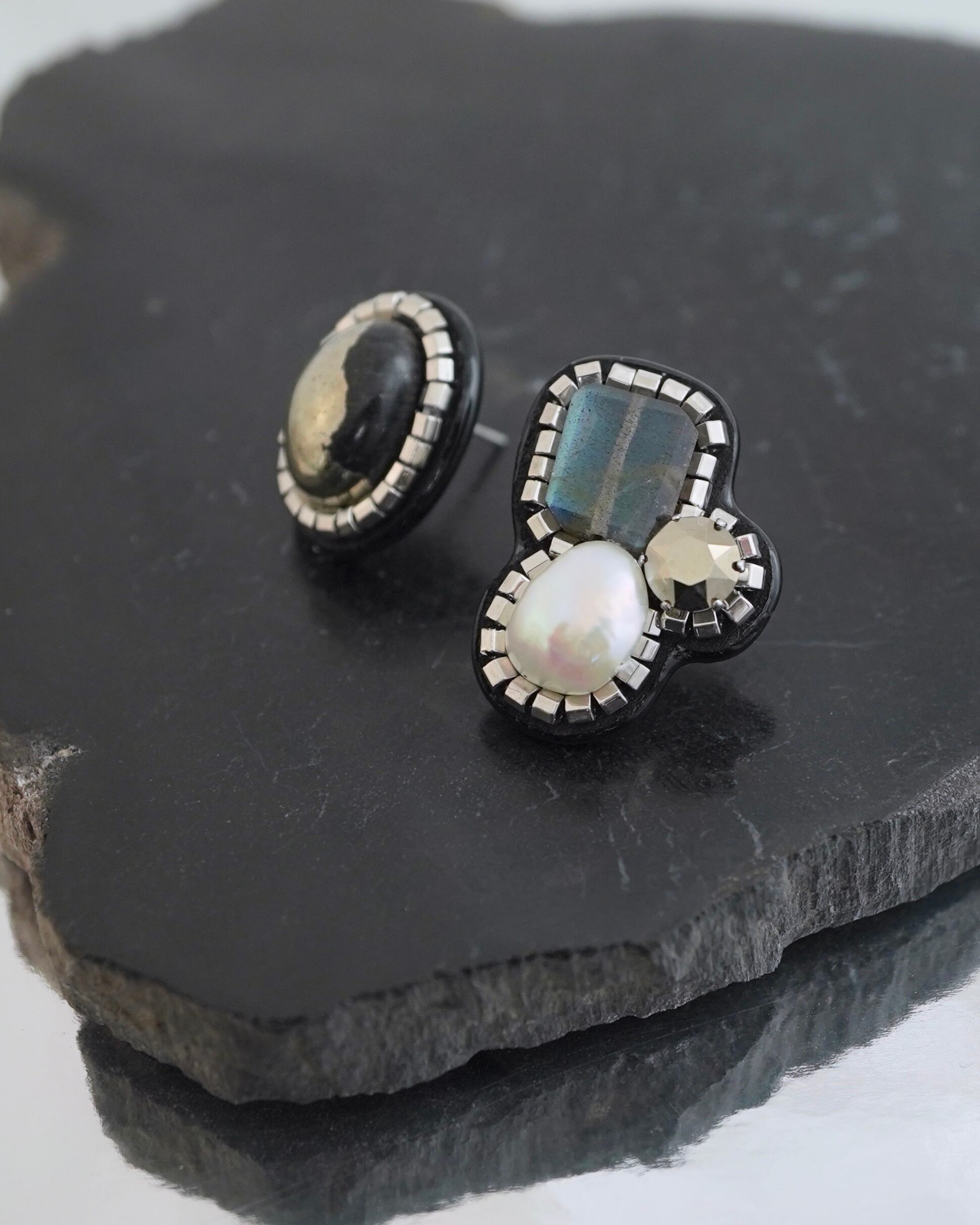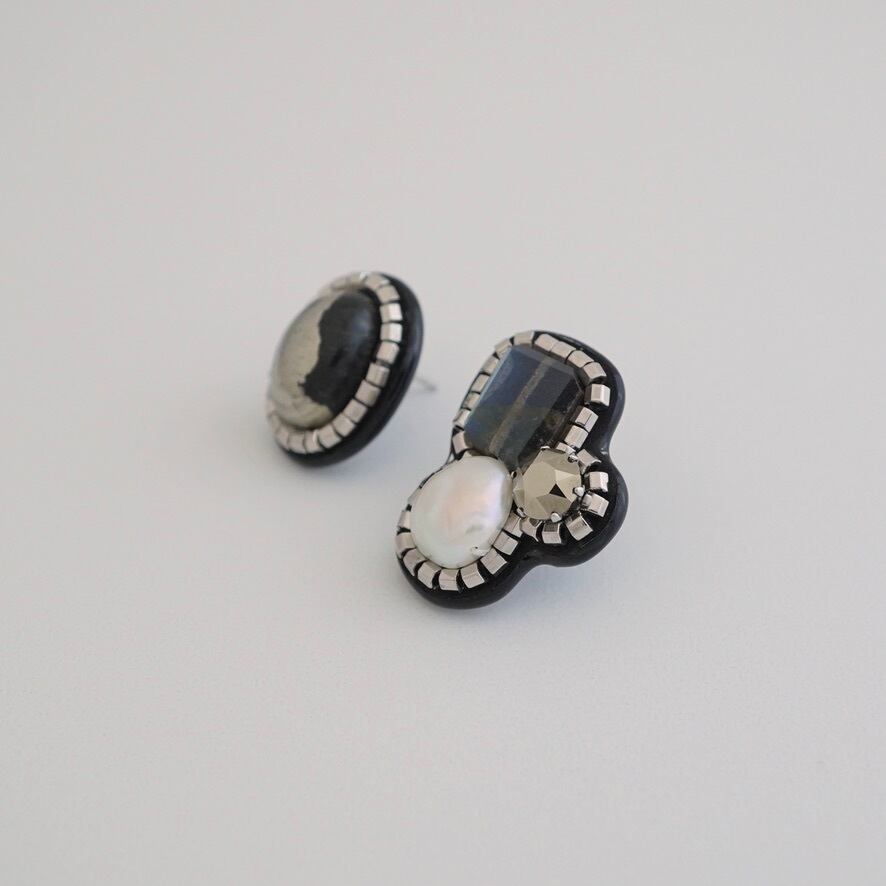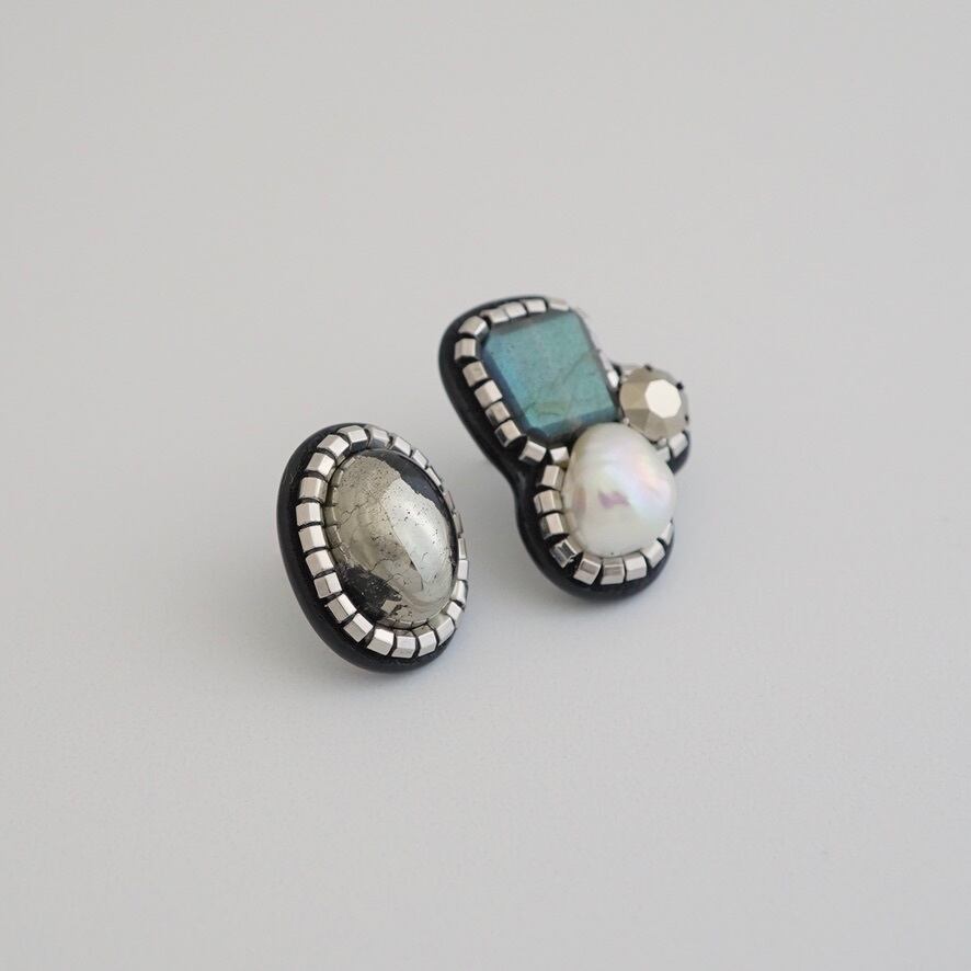 左右のデザインがアシンメトリーなピアス。ラブラドライトがメインの3粒タイプに、マトリックスパイライト1粒を合わせました。メタリックなカラーが効いたデザインです。